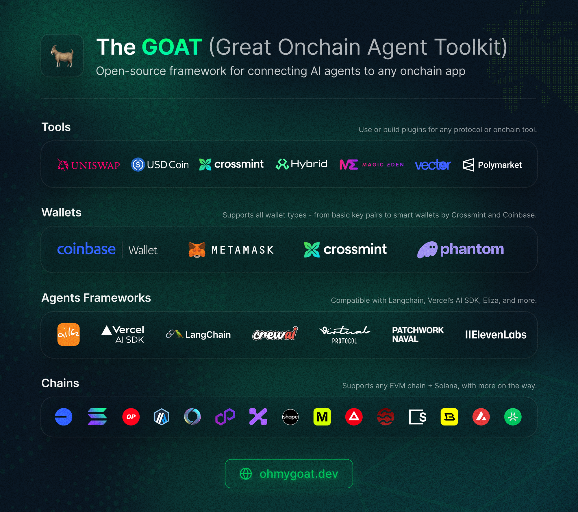 GOAT is a single, unified library of onchain actions, ready to be used in 5 agent frameworks, two programming languages, on any wallet architecture across 30+ chains.