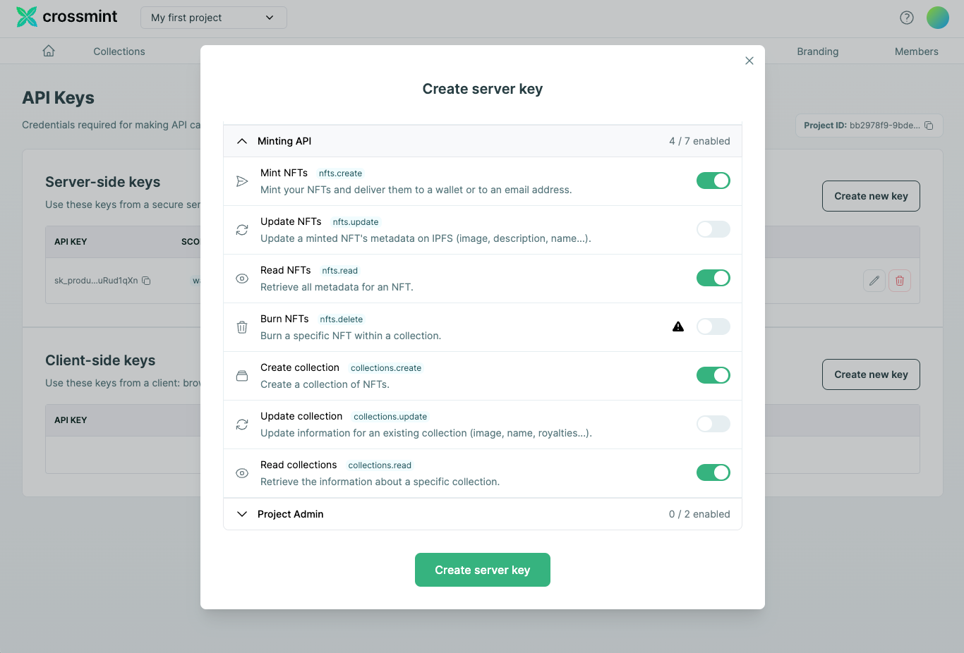 - Choose the Type of API Key: Opt for a Server-side API Key required for operations like NFT collection creation or minting.